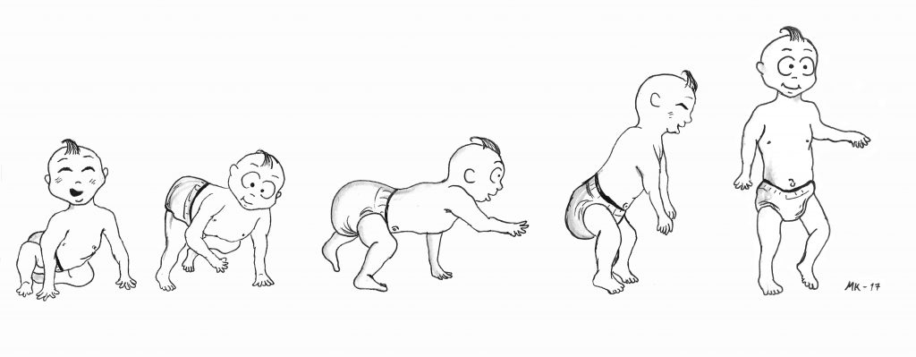 Pystykävely on vaikea laji. Se vaatii kehon kannattelua vuoron perään yhden jalan varassa ja vielä askelluksen sopeuttamista alustaan. Ennen kuin se onnistuu, aivojen liikealueet pitää rakentaa, liike- ja aistinhermosolut kytkeä yhteen ja vieläpä eristää pitkät piuhat rasvaisella myeliinillä. Hermoverkkojen kehityksen lisäksi vartalon mittasuhteiden pitää muuttua, painopisteen siirtyä alemmas ja lihasvoiman kasvaa, ennen kuin vauva voi liikkua pystyssä.